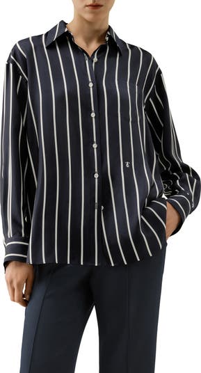 Enhance your fashion quotient with this maritime-themed shirt, embodying timeless grace. Made from premium silk twill, the material showcases a unique diagonal design with a matte finish that’s subtly elegant. The striking stripes on this shirt bring a nod to traditional nautical aesthetics, and its generous cut provides a laid-back, comfortable shape that doesn’t compromise on fashion-forward appeal. Ideal for wearing under a blazer or jacket to achieve a polished appearance, or team it with denim for a chic, everyday look. The shirt’s resistance to wrinkles guarantees a crisp appearance throughout the day, making it an indispensable addition to any closet.