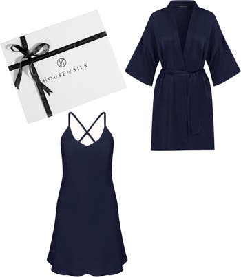 A calming nighttime ritual crafted with silky textures and soothing sensorial notes. The Silky Gift Set is more than a sleep routine — it’s a small yet meaningful ritual you return to each night, with soft light, gentle movement, and a touch that relaxes both body and mind. Featuring the Silky Satin Slip Dress and the matching Silky Satin Robe in a warm salmon tone, this set brings effortless elegance to your evenings while inviting you to slow down and unwind. Gift this sensorial pause to yourself or someone you love — a refined reminder to rest, reset, and feel held by comfort. Set Includes. Silky Satin Slip Dress – Navy. Silky Satin Robe – Navy. Perfect for: nightly wind-down rituals, elevated sleepwear, self-care gifting, and luxurious lounging at home.
