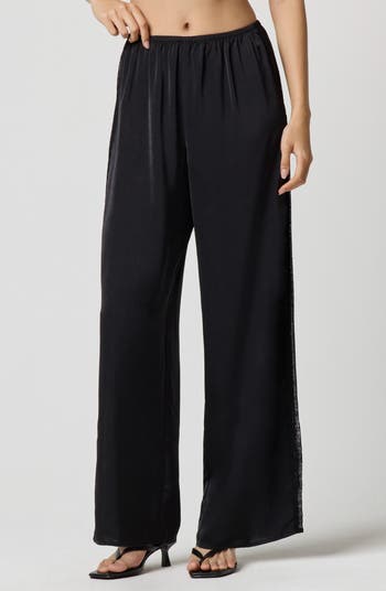 A pretty lace trim adds a sweet touch to these printed wide-leg pajama pants that perfect for lounging.