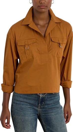 Utility inspo reveals itself in the tab-cinched pockets of this shirt that takes a refined turn thanks to the silky stretch-cotton fabric that gives this hard-working style a bit of graceful drape.