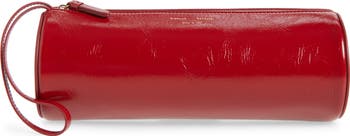 This silo-shaped clutch is crafted from glossy, crinkled calfskin in a rich crimson hue with a glinting goldfoil logo stamped in a dainty font.