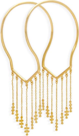 The Silsila Bracelet is a handcrafted 22k gold-plated cuff bracelet made from brass. This open-ended cuff bracelet features a sculptural frame with delicate chains cascading from both ends. Structured yet lightweight, the adjustable cuff bracelet sits comfortably on the wrist and adds subtle movement with wear.