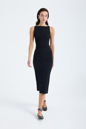 The Silva Midi Dress offers seasonless elegance with a sleek fit, square neckline, and back slit your timeless, minimalist essential for effortless style.