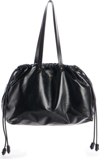 A softly gathered silhouette accentuated with knot-detailed drawstrings defines this roomy tote made from supple lambskin leather.