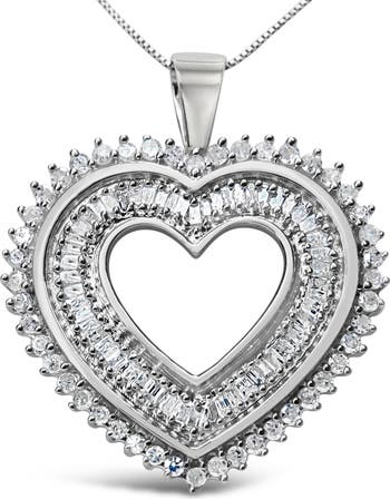 Silver 1.0 Cttw Baguette and Round Diamond Heart Pendant Necklace