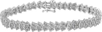 This tennis link bracelet sparkles with a repeating design of a pair of diamonds separated by a thin angled shape that is crafted in sterling silver. There are 96 total diamonds, which have a total weight of 1 carat. The diamonds are promo quality, which are on the lowest on the diamond color and quality scale. Round-cut, promo quality diamonds are milky and cloudy in nature. They have asymmetrical ball shape and are filled with inclusions.