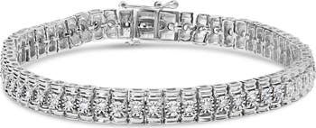 Envelop your wrist in the splendor of countless stars with this exquisite sterling silver bracelet, a testament to timeless elegance. Cradled within sculpted, mirror-polished collars, each diamond twinkles with the promise of a starlit sky, their I-J color and I1-I2 clarity artfully amplified by miracle plates to create an opulent dance of light and shadow. This 7.25-inch adornment, casting 1 carat total weight of diamonds, clasps with the secure embrace of a box clasp, promising not just a dazzling addition to your ensemble but a cherished companion for those occasions where radiance is not just desired, but demanded. This piece is not merely an accessory, but a portal to the very essence of sophistication and grace.
