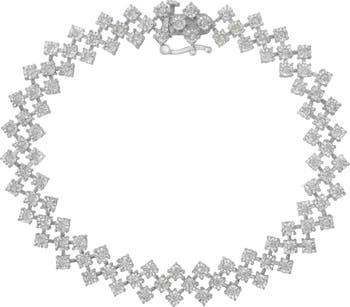 A stunning silver and diamond cluster bracelet. This bracelet is made with 99 natural diamonds with a total 1 carat weight. This women's bracelet features a unique zig zag design where each diamond is set in a miracle plate station and gives the impression that this bracelet was intricately woven together to create weaves of metal, diamond, and white space. The unique miracle-plate setting centers each genuine diamond in a mirror-finish, high-polish frame, giving the illusion of a much larger stone. This bracelet fastens securely with a box clasp and fits wrists up to 7.25 inches long. The diamonds are promo quality, which are on the lowest on the diamond color and quality scale. Round-cut, promo quality diamonds are milky and cloudy in nature. They have asymmetrical ball shape and are filled with inclusions.