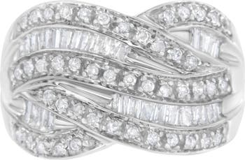 Wow her with this stunning silver and diamond Cocktail ring band. This ring is designed with wave-like features and alternating rows of beautiful, natural baguette and round-cut diamonds. 1 carat of channel set diamonds shine in gleaming .925 sterling silver. This ring is glamorous and has a beautiful bypass design that is everlasting. These diamonds are natural and are color rated I-J and clarity rated I2-I3.