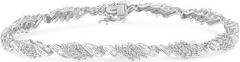 Elegant and timeless, this gorgeous 92.5% sterling silver link bracelet features 1.48 carat total weight of round, brilliant cut diamonds and baguette cut diamonds with a whopping 156 stones in all. The tennis bracelet features three diagonal rows of round diamonds flanked by two silver ribbons inlaid with a single baguette cut diamond on each side. The links have a wave-like shape. This authentic design is crafted of real 92.5% sterling silver that has been electro-coated with genuine rhodium (a platinum-family metal), a precious metal that will keep a tarnish-free shine for years to come. The 7” bracelet fastens with a box with tongue clasp. This sweet bracelet makes a perfect Valentine's Day gift or for any special occasion. It's a classic and feminine piece she'll want to show off every day. Whether worn for daytime glamour or evening sparkle, this bracelet is gorgeously versatile. Give her a gift that will perfectly complement her favorite ensemble.