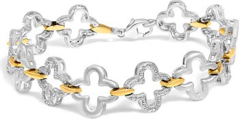 Experience the refined allure of this .925 two-tone sterling silver tennis bracelet, where craftsmanship meets a modern aesthetic. Designed to gleam under any light, the bracelet alternates between rhodium-plated silver and intricately gold-plated links, forming an enchanting dance of colors. Wisps of natural diamonds, totaling 1/10 cttw, nestled within clover-shaped frames, introduce a celestial sparkle, while sections of matte finish offer a tactile contrast, enhancing the bracelet's visual depth. Ideal for wrists up to 7.25 inches, the secure clasp promises a fit both snug and comfortable, ensuring that elegance accompanies you with every gesture. Embrace this piece as not only an accessory but a testament to exquisitely balanced design.