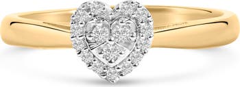 This enchanting engagement ring intertwines classic charm with the sparkle of natural love, destined to capture hearts. Crafted in smooth, 14K yellow gold-plated .925 sterling silver, this piece features a romantically heart-shaped centerpiece. Here, the purity of white silver forms a stage for meticulously arranged, round-cut diamonds totaling 1/10 carat. Each diamond, with an I-J color and I3 clarity, is prong-set to dance under the light's touch. The radiant cluster pattern of these natural diamonds echoes an everlasting commitment, as timeless as it is luminous. Perfect for proclaiming a life together, the ring's dual-tone elegance and delightful sparkle make a profound statement of love and dedication.