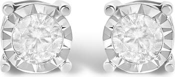 Celebrate any occasion with these classic shimmering diamond stud earrings. Fashioned in .925 sterling silver, each earring showcases a sparkling ¼ carat round, brilliant cut, miracle-set diamond solitaire. The unique miracle-plate setting centers each genuine diamond in a mirror-finish, high-polish frame, giving the illusion of a much larger stone. Dazzling with a bright polished shine, these post earrings secure comfortably with friction posts and butterfly backs. This authentic design is crafted of real 92.5% sterling silver that has been electro-coated with genuine rhodium (a platinum-family metal), a precious metal that will keep a tarnish-free shine for years to come. These classic earrings make a great gift for any special occasion! Whether worn for daytime glamour or evening sparkle, these studs are gorgeously versatile. Coordinate these earrings with your favorite diamond necklace or other diamond jewelry to create a complete elegant ensemble.