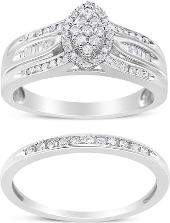 Celebrate your magical union with this classic and everlasting diamond engagement set. This bridal set features two rings with a total carat weight of 1/2 c.t. The primary ring has a central oval motif that is beautifully set with a cluster of round-cut diamonds, flanked by even more dazzling diamonds on all sides. The band is crafted from genuine .925 sterling silver, a metal that will stay tarnish free for years to come, and is inlaid with two rows of round-cut diamonds with a row of baguette-cut diamonds in the middle. The secondary ring is a thin, .925 sterling silver band elegantly set with 11 round-cut diamonds. This breathtaking engagement set is the perfect way to start the loving union of two souls destined to be together!