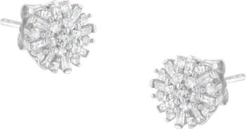 Silver 1/2 Round and Baguette Diamond Sunburst Floral Cluster Stud Earrings