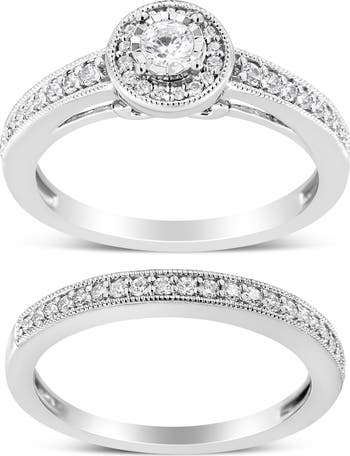 Silver 1/2Ctw Diamond Halo & Milgrain Engagement Ring Bridal Set