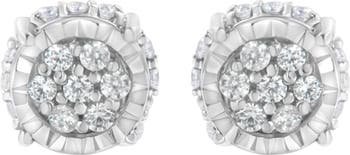 These delicate stud earrings have a unique design. Crafted in sterling silver, these earrings showcase 1/3ct TDW of promo quality diamonds. 7 round cut diamonds sit at the center of a circular stud. Surrounded by a silver halo. Shimmering on the sides of the design additional round diamonds adorn the studs. A push back mechanism keeps the earring secure and you worry free. Promo quality diamonds are on the lowest of diamond color and quality scale. Round-cut, promo quality diamonds are milky and cloudy in nature. They have asymmetrical ball shape and are filled with inclusions.