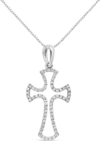 Celebrate your inner spirituality with this beautiful and unique diamond cross pendant. This necklace is designed with an outline of a cross, embellished with a 1/3 cttw of natural, round-cut diamonds. The diamonds are set onto genuine .925 sterling silver, plated with rhodium (a platinum-family metal) for a lifetime of tarnish-free wear. It comes with an 18" inch box chain. This is the perfect piece to embrace and honor your faith.