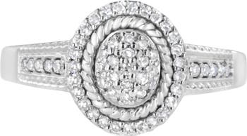 This ring is created in sterling silver and features 1/3ct TDW of diamonds. A glittering round cut diamond cluster sits at the heart of this ring design. A sterling silver rope and a diamond inlaid ribbon create a double halo that wrap around the central cluster. The ring band showcases a row of diamonds held in between a silver rope design.