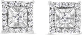 Silver 1/4 Ct Princess and Round Diamond Halo Stud Earrings