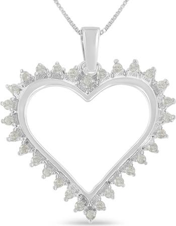 A shimmering halo of prong set, round cut diamonds sit around a lovely open heart pendant. 1/4ct TDW of diamonds sparkle in this sterling silver design. The pendant hangs from a box chain that secures with a spring ring clasp.