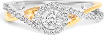 Draped in elegance and encased in modern romance, this mesmerizing promise ring features an exquisite blend of 14K yellow gold-plated .925 sterling silver, intertwined with glistening silver accents, presenting a dramatic canvas for the dance of light performed by natural diamonds. At the heart lies a bewitching round diamond, magnificently framed by a halo of twinkling stars set against a divine miracle plate, amplifying its luminous allure. Each side diamond, held gracefully by a prong setting, continues the ring's story of eternal sparkle with I-J color and I3 clarity that radiate from every facet. This artful creation marries the warmth of yellow gold with the timeless elegance of silver, crafting a piece that promises not just undying love but also a testament to sophisticated craftsmanship in every detail.