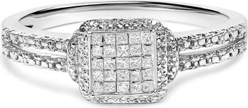 Whether you’re wearing it as a fashion piece or as an engagement ring, this piece will definitely be a conversation starter. Crafted in .925 Sterling Silver, the ring is adorned with 25 princess-cut diamonds in an invisible setting that total up to 1/4 cttw in the center. Beading details — that surround the stones to the band — take the design to the next level. The piece is completed with a double beaded shank for extra bit of elegance.