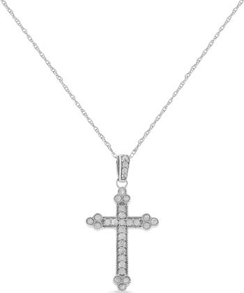 Celebrate your inner spirituality with this art-deco diamond cross pendant. This necklace is embellished with a 1/4 cttw of natural, round-cut diamonds. The cross is designed with extra flair as a trio of diamonds are at each end. The prong-set diamonds are set onto genuine .925 sterling silver, plated with rhodium (a platinum-family metal) for a lifetime of tarnish-free wear. It comes with an 18" inch box chain. This is the perfect piece to embrace and honor your faith. The diamonds are promo quality, which are on the lowest on the diamond color and quality scale. Round-cut, promo quality diamonds are milky and cloudy in nature. They have asymmetrical ball shape and are filled with inclusions.