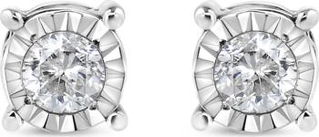 Add a shimmering touch to your wardrobe with these elegant and extravagant diamond earrings. Fashioned in the round shape, the earrings are crafted of your choice of sterling silver flashed with white rhodium, or with 10K rose or yellow gold electroplating. Each of the studs captivates with a miracle plated fluted frame setting, which gives the illusion of a larger diamond and makes them shine like countless stars glitter in the sky. Butterfly push-backs on friction notched posts ensure carefree all-day wear.