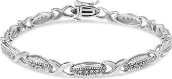 Elevate your style with this elegant silver bracelet showcasing a unique design of "X" and ovular links. Each ovular silver links showcases four natural, round-cut diamonds in a classy prong setting. The bracelet is set in genuine .925 sterling silver, plated with rhodium (a platinum-family metal) for a lifetime of tarnish-free wear. The piece comes with a box clasp mechanism for a secure and seamless fit. This 1/5 cttw bracelet is the perfect addition to your jewelry collection.