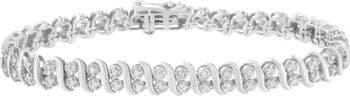 Crafted in cool sterling silver, this bracelet showcases 1ct TDW of promo quality diamonds. This stunning design glistens with a double row of round cut diamonds set within S shaped ribbons that link and give life to this design that secures with a box with clasp mechanism. Promo quality diamonds are on the lowest of diamond color and quality scale. Round-cut, promo quality diamonds are milky and cloudy in nature. They have asymmetrical ball shape and are filled with inclusions.