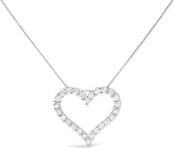 Bask in the radiance of timeless elegance with this breathtaking heart-shaped pendant, meticulously crafted from .925 sterling silver. Adorned with shimmering natural diamonds totaling 2.0 carats, each stone boasts an enchanting I-J color and intriguing I2-I3 clarity, casting a mesmerizing sparkle that captures the light at every angle. The delicately open heart design gracefully outlines the symbol of love, with diamonds precisely set along its edges, creating a dazzling dance of luminescence. Enhanced with a lustrous rhodium plating, this pendant not only gleams with sophistication but also promises enduring durability. Suspended from an 18-inch box chain, it rests perfectly on your collarbone, secured with a reliable spring ring clasp. This necklace is more than an accessory it's an expression of unwavering affection and a testament to impeccable craftsmanship.
