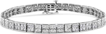 This beautiful link bracelet has a glamorous twist on a classic design. Square silver links are embellished with four stunning round-cut diamonds in an elegant prong setting. This authentic design is crafted of real 92.5% sterling silver that has been electro-coated with genuine rhodium (a platinum-family metal), a precious metal that will keep a tarnish-free shine for years to come. This bracelet has a total diamond weight of 2 carats, and is the perfect accessory for any formal event.