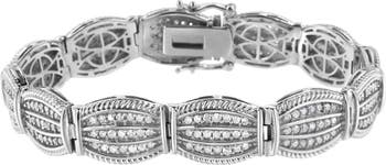 Uniquely designed, this silver tennis bracelet is unlike anything you've come across. Three rows of natural, round-cut diamonds sparkle in art deco style links that give the piece a striking look. This authentic design is crafted of real 92.5% sterling silver that has been electro-coated with genuine rhodium (a platinum-family metal), a precious metal that will keep a tarnish-free shine for years to come. This bracelet boasts an impressive total diamond weight of 3 carats, and will make for a stunning addition to your jewelry collection.