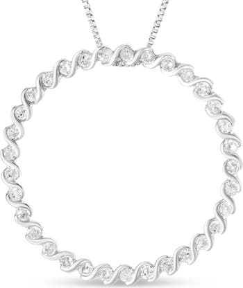 This gorgeous .925 sterling silver pendant necklace brings together love and life full circle with a chic open circle edged by glittering round, prong-set diamonds. The perennial beauty of this necklace makes it the perfect choice to wear for all occasions and for every style. The diamonds in this piece total 3/4 cttw and are of an approximate I-J color and I3 clarity. The contemporary 18" rope chain beautifully complements any neckline and secures with a spring ring clasp.