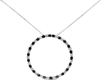Discover an enchanting interplay of light and darkness wrapped elegantly around your neck with this exquisite pendant necklace. Crafted in rhodium-plated .925 sterling silver, the piece features a captivating circular design, enriched with the striking contrast of deep, richly treated black diamonds and the sparkling brilliance of natural white diamonds. Totalling 3.0 carats, the alternating gems dance in harmony, reflecting both contemporary chic and timeless grace. The 18-inch box chain drapes beautifully, secured with a user-friendly spring ring clasp, ensuring that this necklace not only lays comfortably but also exudes sophistication. Perfect for those who appreciate the art of subtlety paired with remarkable craftsmanship, this necklace promises to be a versatile addition to any jewelry collection, offering a touch of luxury for any occasion.