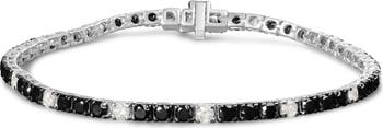 Elevate your style with this striking .925 sterling silver tennis bracelet, featuring a dazzling 5.0 carats of natural diamonds. Alternating between the brilliance of white diamonds and the rich, vivid tones of color-treated black diamonds, this bracelet creates a captivating contrast that draws attention with every move. The round-cut diamonds, with I-J color and I2-I3 clarity, are set in a polished, rhodium-plated 4 prong setting, offering both enhanced shine and lasting durability. Black rhodium accents add a bold touch to the black diamonds, amplifying their allure and depth. Fitting wrists up to 7.25 inches, the bracelet sits gracefully on your wrist and secures with a sturdy box clasp and safety latch for confidence and comfort. Whether you’re dressing for an elegant evening or adding a touch of sophistication to your daily wear, this exquisite piece adds a timeless charm and modern flair to any look. Make every occasion special with this beautifully crafted statement accessory.