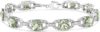 Classy and feminine, this green amethyst and diamond tennis bracelet is designed especially for your lady love. Styled in remarkable sterling silver this bracelet is embellished with 10 alluring prong set cushion cut green amethyst accentuated by 10 brilliant round cut diamonds in prong setting. Fastens with a secure clasp. Total diamond weight is 1/20 ctw and each cushion cut green amethyst measures 7x7 mm.