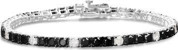 Elevate your style with this striking .925 sterling silver tennis bracelet, featuring a dazzling 8.0 carats of natural diamonds. Alternating between the brilliance of white diamonds and the rich, vivid tones of color-treated black diamonds, this bracelet creates a captivating contrast that draws attention with every move. The round-cut diamonds, with I-J color and I2-I3 clarity, are set in a polished, rhodium-plated 4 prong setting, offering both enhanced shine and lasting durability. Black rhodium accents add a bold touch to the black diamonds, amplifying their allure and depth. Fitting wrists up to 7.25 inches, the bracelet sits gracefully on your wrist and secures with a sturdy box clasp and safety latch for confidence and comfort. Whether you’re dressing for an elegant evening or adding a touch of sophistication to your daily wear, this exquisite piece adds a timeless charm and modern flair to any look. Make every occasion special with this beautifully crafted statement accessory.