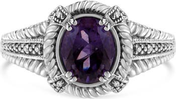 This exquisite amethyst and diamond ring will stun your beloved. Fashioned in radiant sterling silver this dazzling ring showcases a large centrally staged oval cut amethyst embellished with 8 pave set single cut diamonds engrossed by a bright finish rope design on the borders. Total diamond weight is 1/50 ctw and amethyst measures 9x7 mm.