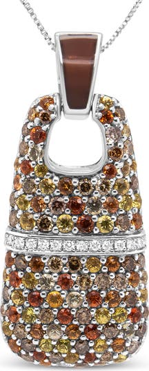 Richly colored in a clear milk chocolate enamel, this pendant necklace highlights the splendor of round diamonds and natural gemstones in shared prong settings amidst genuine .925 sterling silver. The captivating pendant is riddled in warm colors emanating from white and brown diamonds along with natural, color-treated 1.5mm yellow and orange sapphires. These hues cast an all-over design, with a band of white diamonds along the center. The diamonds in this piece total 1 cttw with an approximate VS1-VS2 clarity and white F-G color. The contemporary yet classic 18" box chain complements any neckline beautifully and secures with a spring ring clasp.