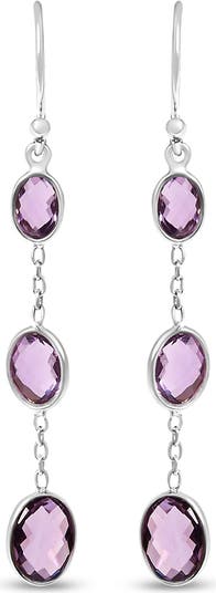 Discover a radiant symphony of color and craftsmanship with this stunning pair of drop earrings, featuring natural purple amethysts with an enchanting checkerboard cut that dances in the light. Each of the three oval gemstones sparkles within a secure bezel setting, ensuring both protection and prominence. Crafted from rhodium-plated .925 sterling silver, these earrings boast not only a brilliant luster but also commendable durability. Untreated for a pure, resonant hue, these amethysts hang elegantly, about 2 inches in drop, allowing for eye-catching movement that accentuates your every gesture. A refined choice for those who cherish unique design and natural beauty, these earrings promise to elevate any ensemble with their graceful allure.