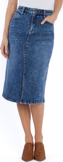 A front slit lets you stride smoothly through your day in this stretch-kissed denim skirt cut to an on-trend midi length.