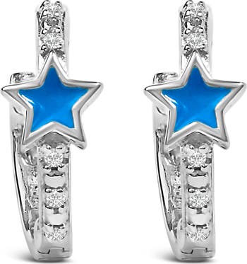 Silver Diamond Accent and Blue Enamel Star Hoop Earrings
