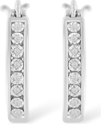 Sophisticated hoop earrings that features 16 genuine diamonds in two different cut-shapes, round and miracle. The earrings present a vertical format made with .925 sterling silver, which is filled with diamonds. This is a perfect choice for special occasions or formal events. It comes with a latch back as an earring finding for comfort purposes. The diamonds are promo quality, which are on the lowest on the diamond color and quality scale. Round-cut, promo quality diamonds are milky and cloudy in nature. They have asymmetrical ball shape and are filled with inclusions.