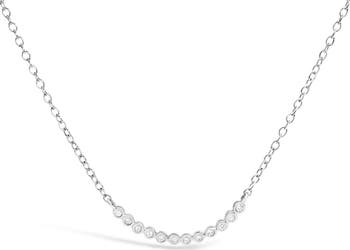 Envelop your neckline in the subtle splendor of this exquisite necklace, where craftsmanship meets grace in .925 sterling silver, augmented by a durable rhodium finish for an everlasting shimmer. The central allure of this piece is the elegantly curved bar, studded with natural white diamonds that trace its delicate arc like stars in the night sky. Each diamond, responsibly sourced, plays its part in this celestial display, offering a sparkle that captures both the light and the admiration of onlookers. This 18-inch treasure is strung securely on a versatile cable chain, closing neatly with a spring ring clasp designed for ease and enduring wear. Perfect for both everyday elegance and special soirées, this necklace invites a touch of luxury into the life of its wearer, becoming a cherished part of their story.