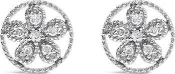 Imbued with the elegance of the night sky, these enchanting stud earrings bring together the celestial charm of stars with the grounded symmetry of wheels, crafted in rhodium-plated .925 sterling silver for enduring luster. Each piece features a captivating circular design, highlighted by earth-mined diamonds that sparkle subtly with an I-J color and I2-I3 clarity, reflecting the mysteries of a starlit night. The meticulous milgrain detailing along the borders lends a touch of vintage art deco sophistication, making these earrings not just accessories, but a testament to timeless craftsmanship. Perfect for secure wear, they come equipped with push-back closures, ensuring they stay in place as you navigate through your day or dazzle at special events.