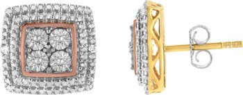 This stunning square-shaped stud earrings are made with an assortment of 10k yellow, white, and rose-gold plated sterling silver. The front-facing design of this piece features white beading with a sliver of rose-gold plated sterling silver at the center. Two natural, round-cut diamonds sit on either side of each earring, giving the piece a total diamond weight of 0.02 ct. These studs are the perfect collection to you jewelry collection, and come with a push back mechanism for a more secure fit.