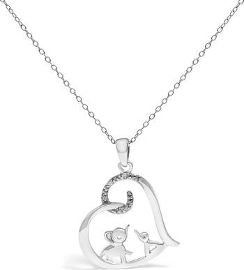 Immerse yourself in the tender embrace of familial bonds with this exquisite necklace, masterfully crafted from rhodium-plated .925 sterling silver for enduring luster and strength. Its heart-shaped pendant delicately cradles two silver elephants, their trunks intertwined in a symbol of the unbreakable connection between mother and child. Highlighted by the soft shimmer of four natural diamonds totaling 0.04 carats, each stone reflects the purity of J-K color and I2-I3 clarity, adding a celestial sparkle to the ensemble. Dangling gracefully from an 18-inch sterling silver rope chain secured with a spring ring clasp, this piece captures the essence of love and protection. A touching tribute to maternal love, it serves not only as a stunning adornment but as a poignant reminder of those we hold dear.