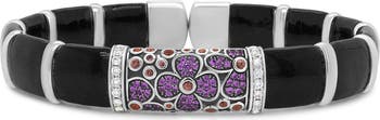 This statement bangle bracelet is a showstopper thanks to its intricate detail and sparkling collection of diamonds and gemstones. Crafted of fine .925 sterling silver with black and brown enamel, this bangle stuns in a floral motif. The natural 1mm round color-treated pink sapphires cluster together to form the petals of the flower blossoms, and are accompanied by 1mm and 1.5mm round color-treated orange sapphires. Flanking this flower depiction are rows of round, prong-set white diamonds that total 1/3 cttw with an approximate F-G Color and VS1-VS2 Clarity. This bracelet is 7.75 inches long, best for small and medium sized wrists.